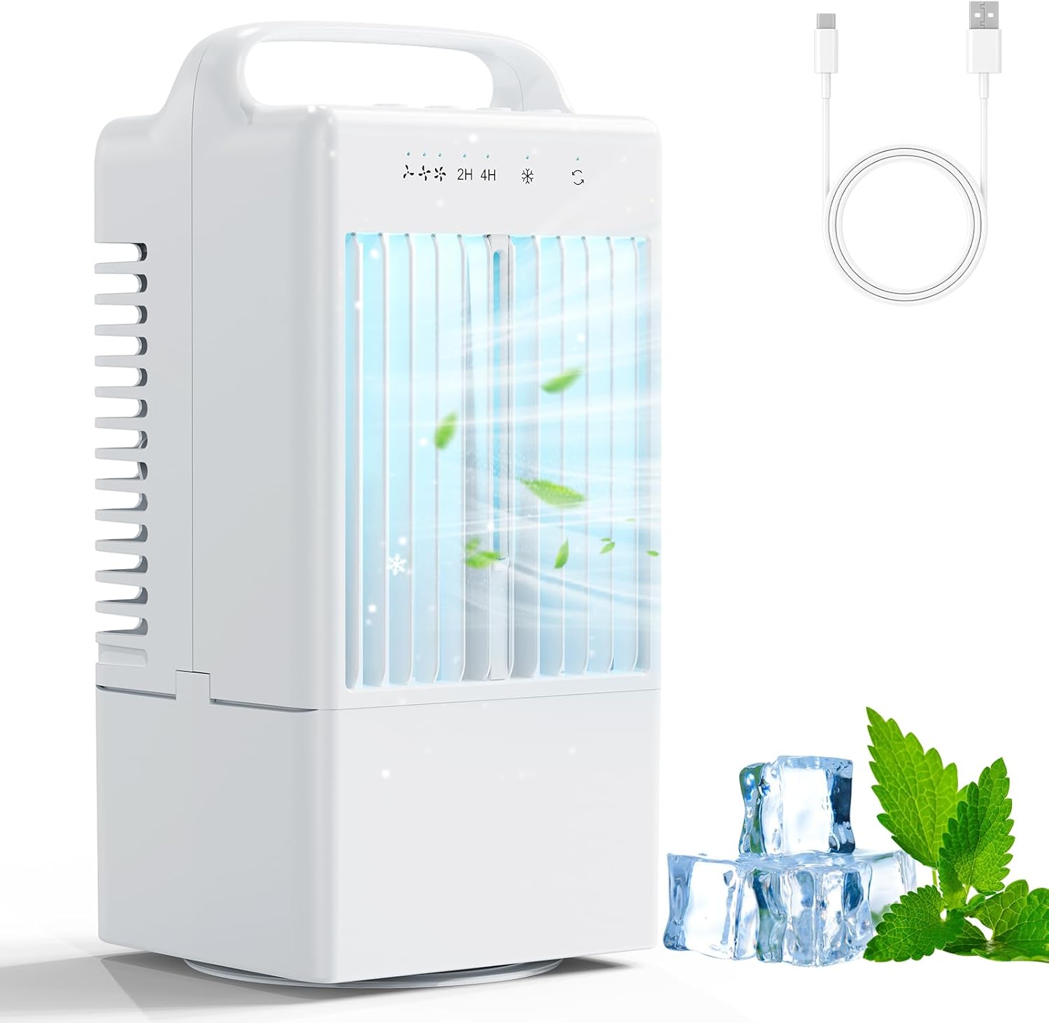 【 Air climatisé portable à faible consommation 】 Ce refroidisseur d’air a une puissance de seulement 8 W et utilise la technologie de refroidissement sans fréon, ce qui réduit efficacement la consommation d’énergie, idéal pour une utilisation prolongée. Avec une poignée légère et de multiples options d’alimentation USB, il est facile à transporter et à utiliser, parfait pour les chambres, les cuisines, les bureaux, les camping-cars et les activités de plein air comme le camping.
